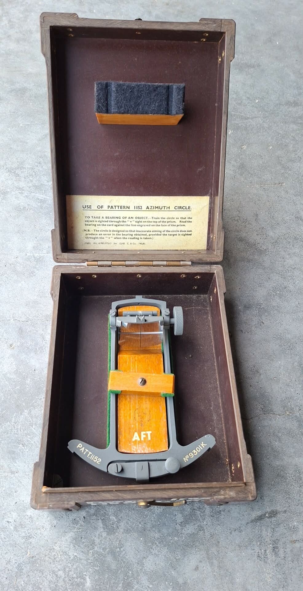 Vintage militaire azimutcirkel 1152 uit de Tweede Wereldoorlog met bakelieten etui.